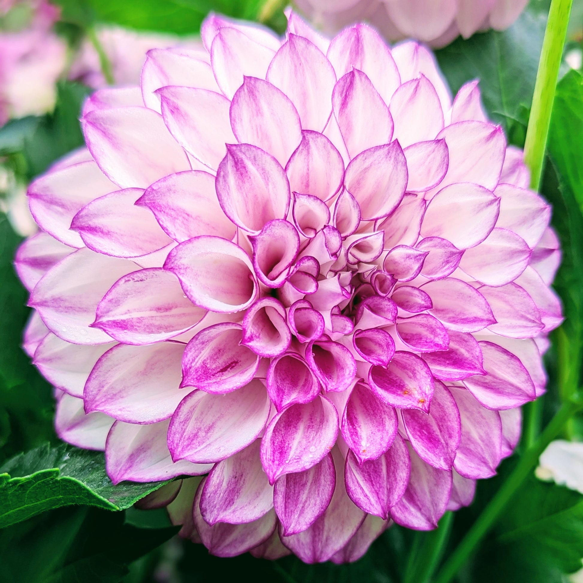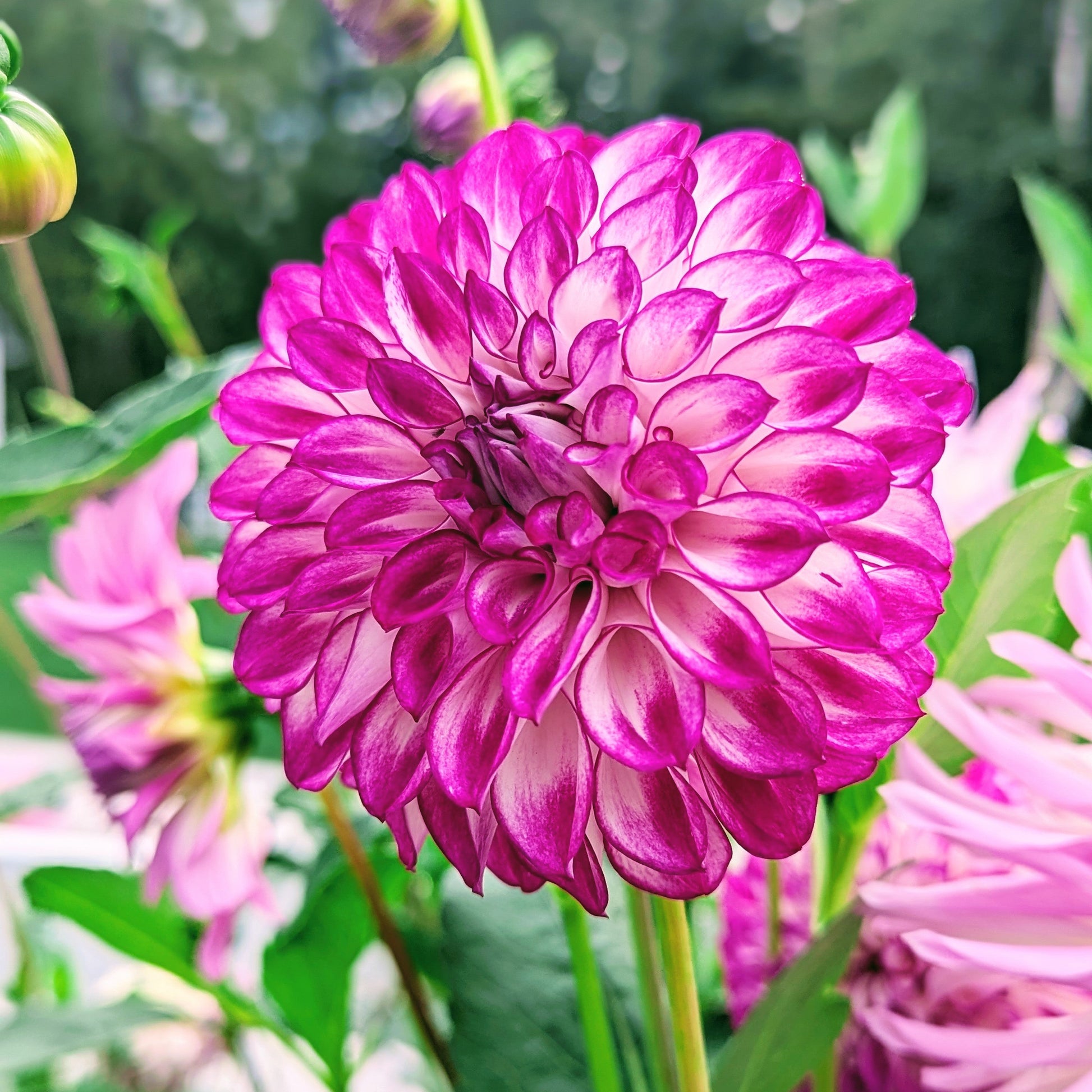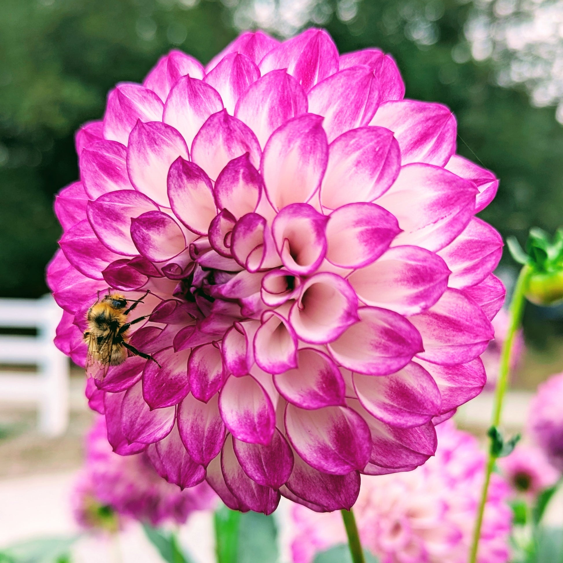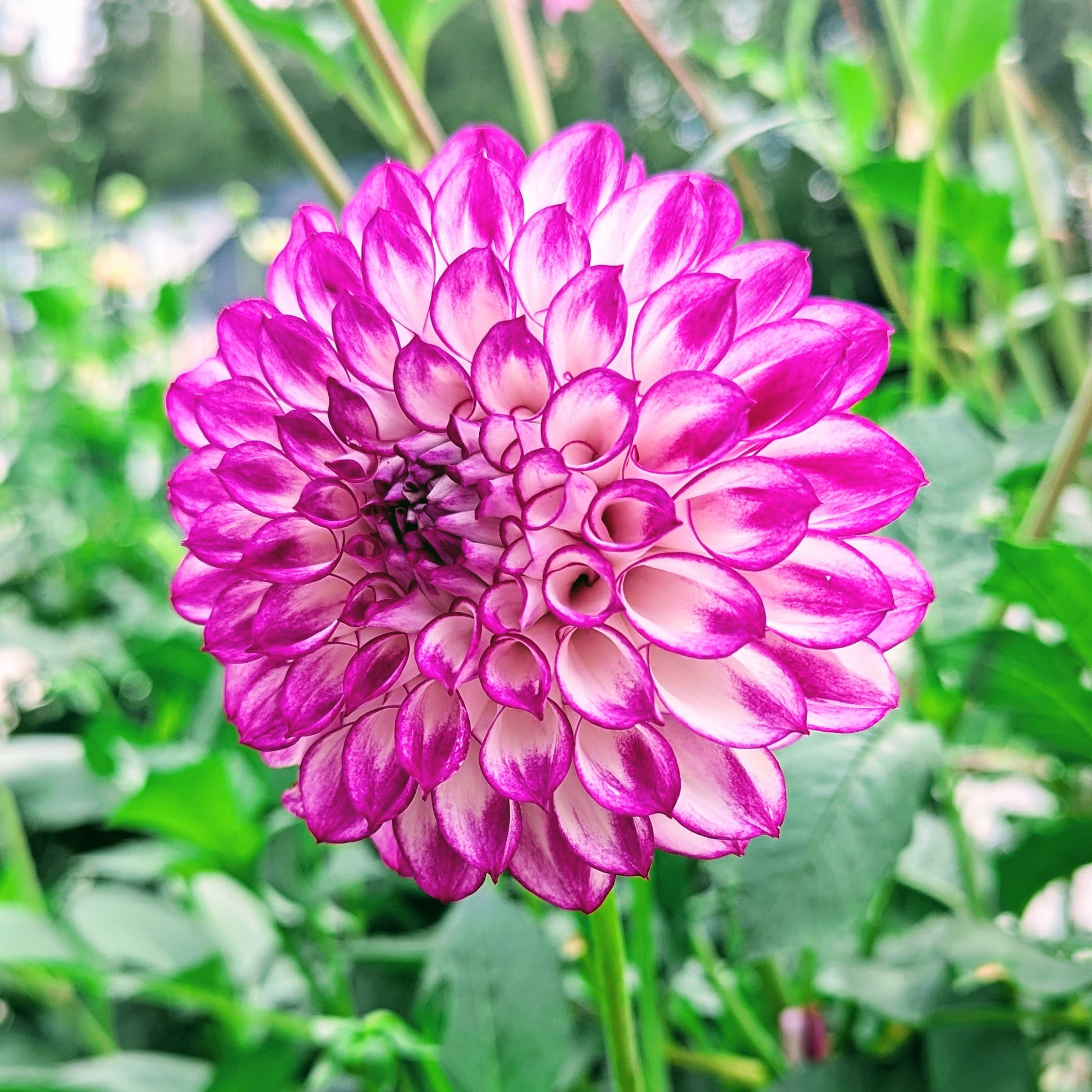 A stark white interior acts as the perfect background to really make that magenta pop! A standout in the garden with tall strong stems and vibrant coloring. She won the contest this year for most viable tubers from a single plant with 32!