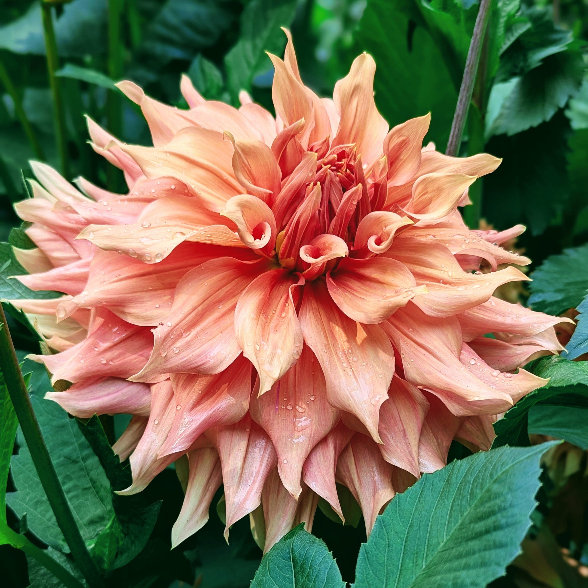 Generous 8" blooms on a 6' plant. Heavy heads nod occasionally on long stems, but the abundance of bronzy salmon petals is absolutely worth it.