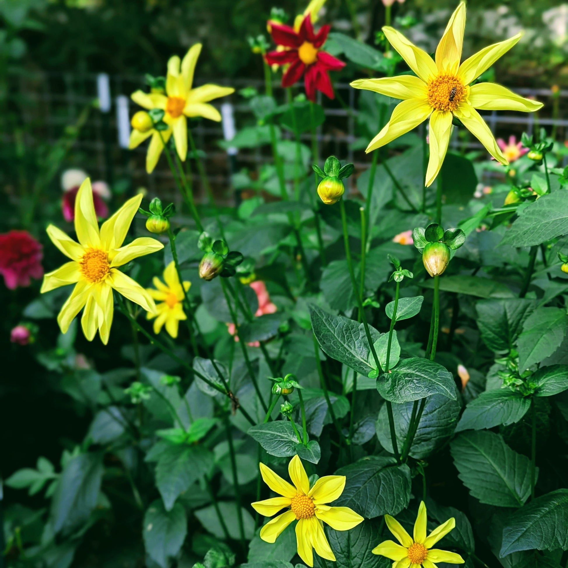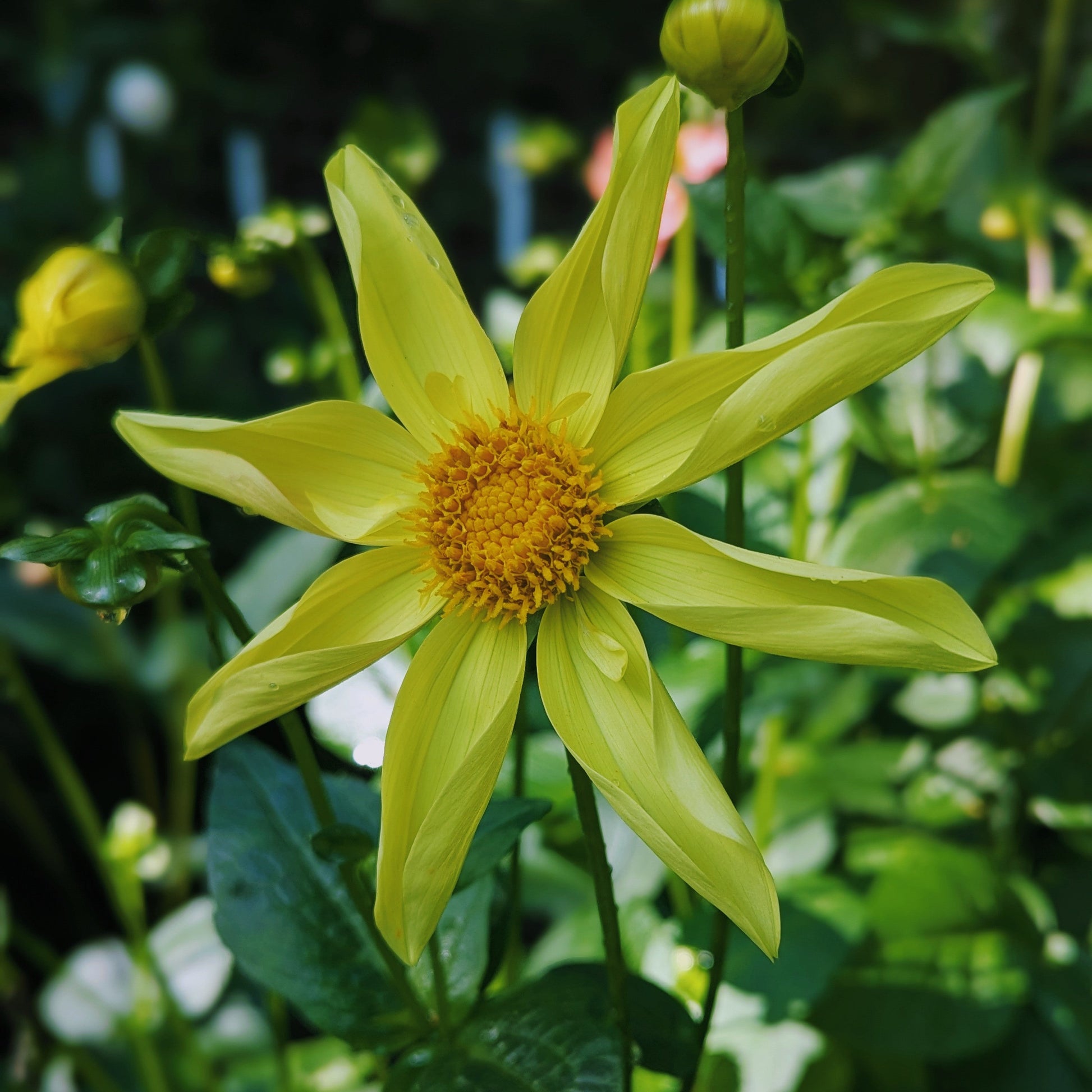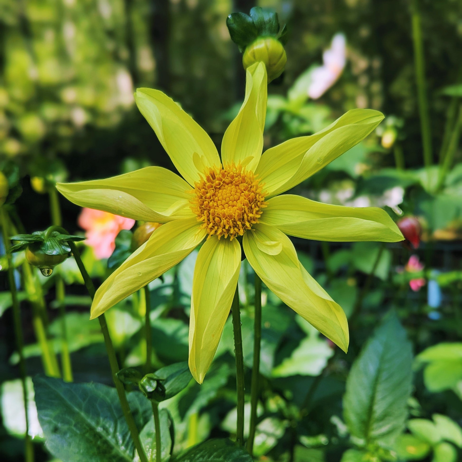 I broadened my horizons a bit this year, and tried to add more forms to my garden. This sunny orchette incorporates the curled petals that give the orchids their star shape, and the little petaloids of the collarettes that make them so cheery. Plants put out great stems, and lush foliage.