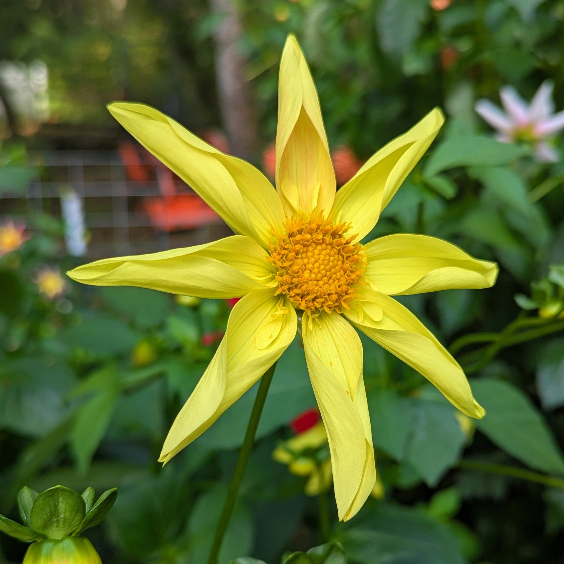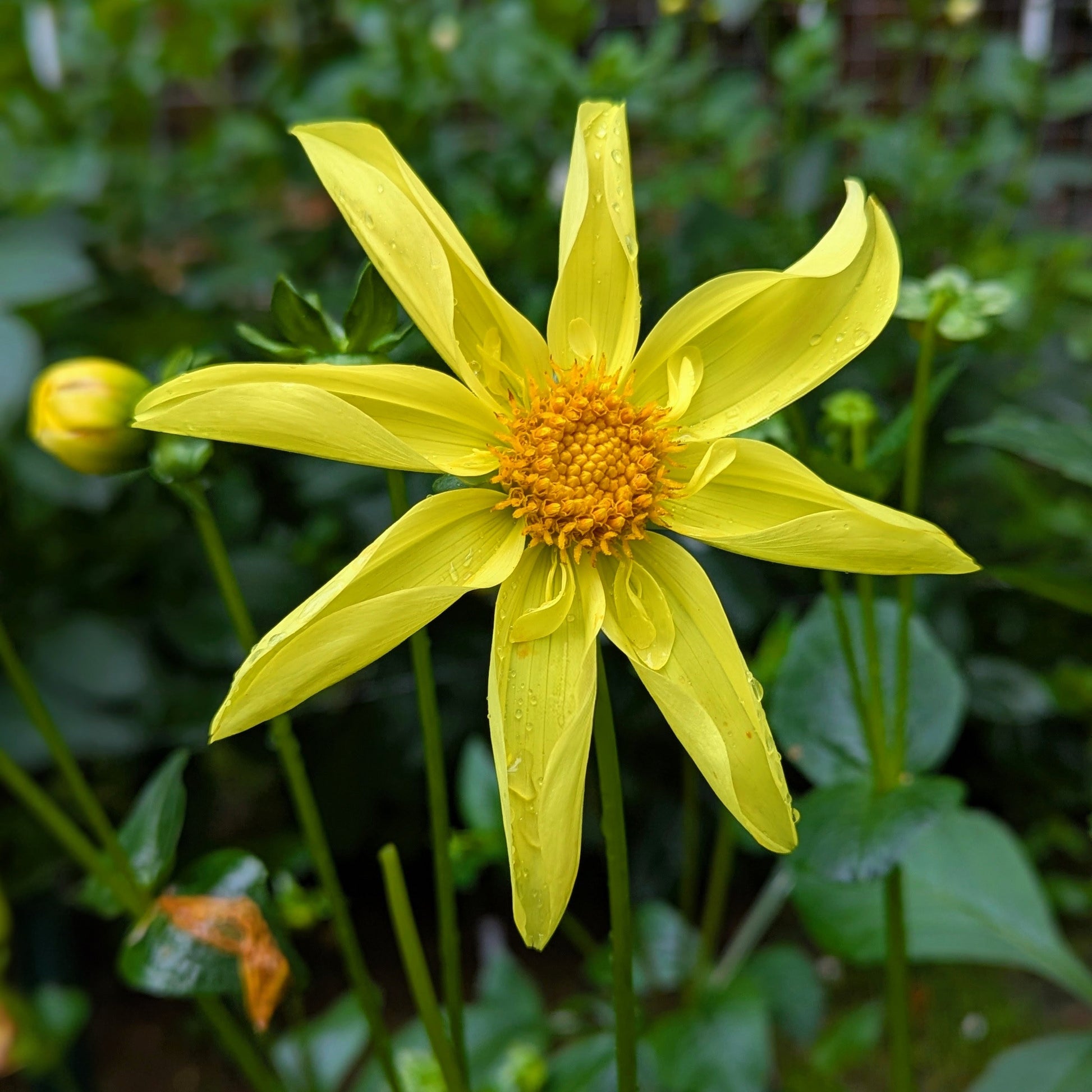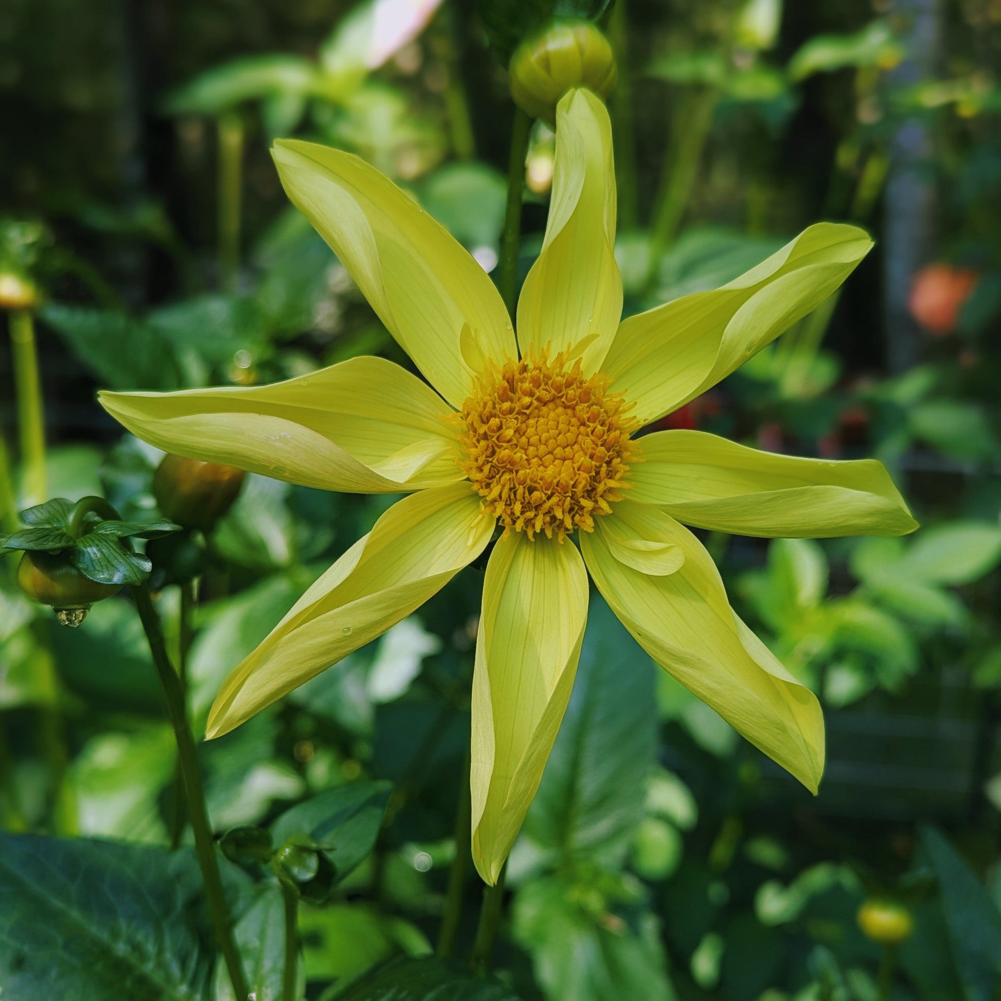 I broadened my horizons a bit this year, and tried to add more forms to my garden. This sunny orchette incorporates the curled petals that give the orchids their star shape, and the little petaloids of the collarettes that make them so cheery. Plants put out great stems, and lush foliage.