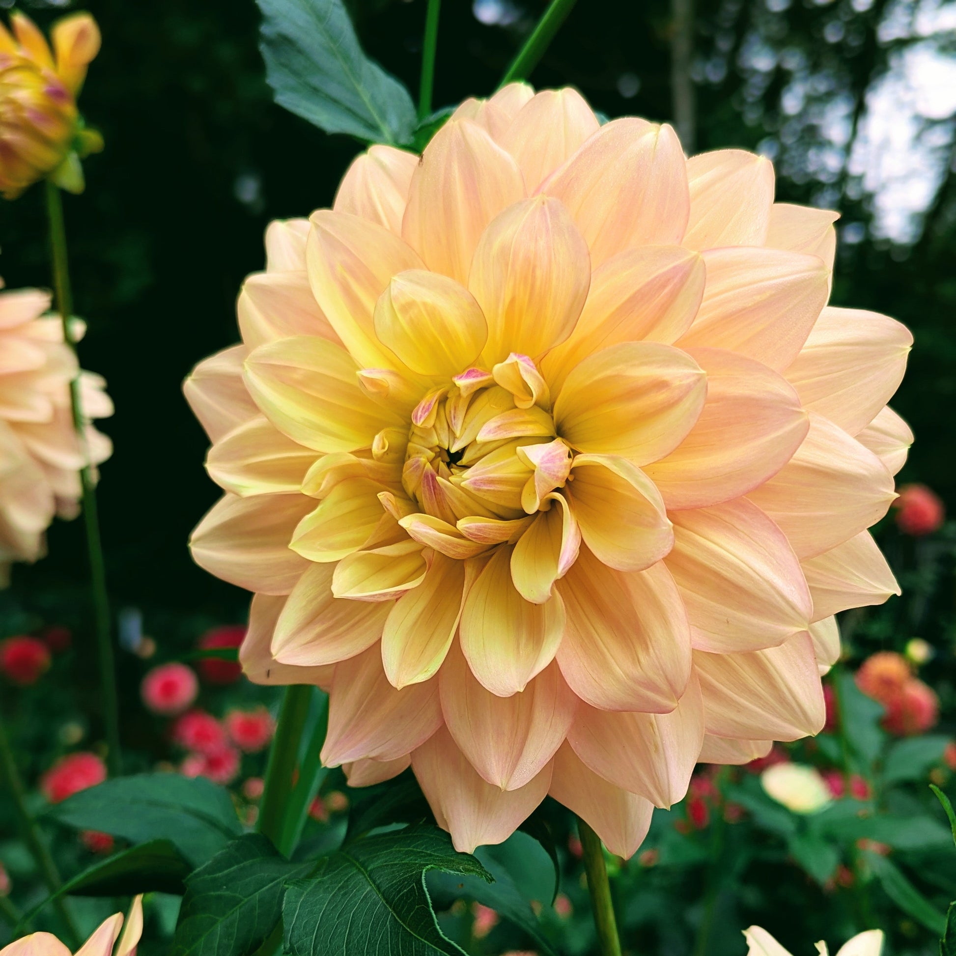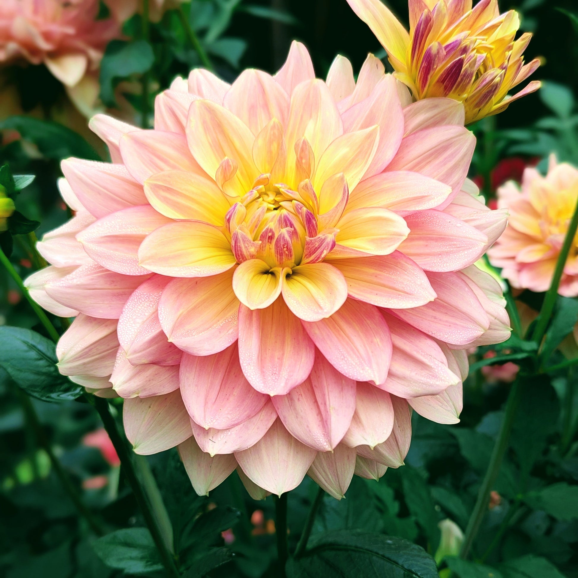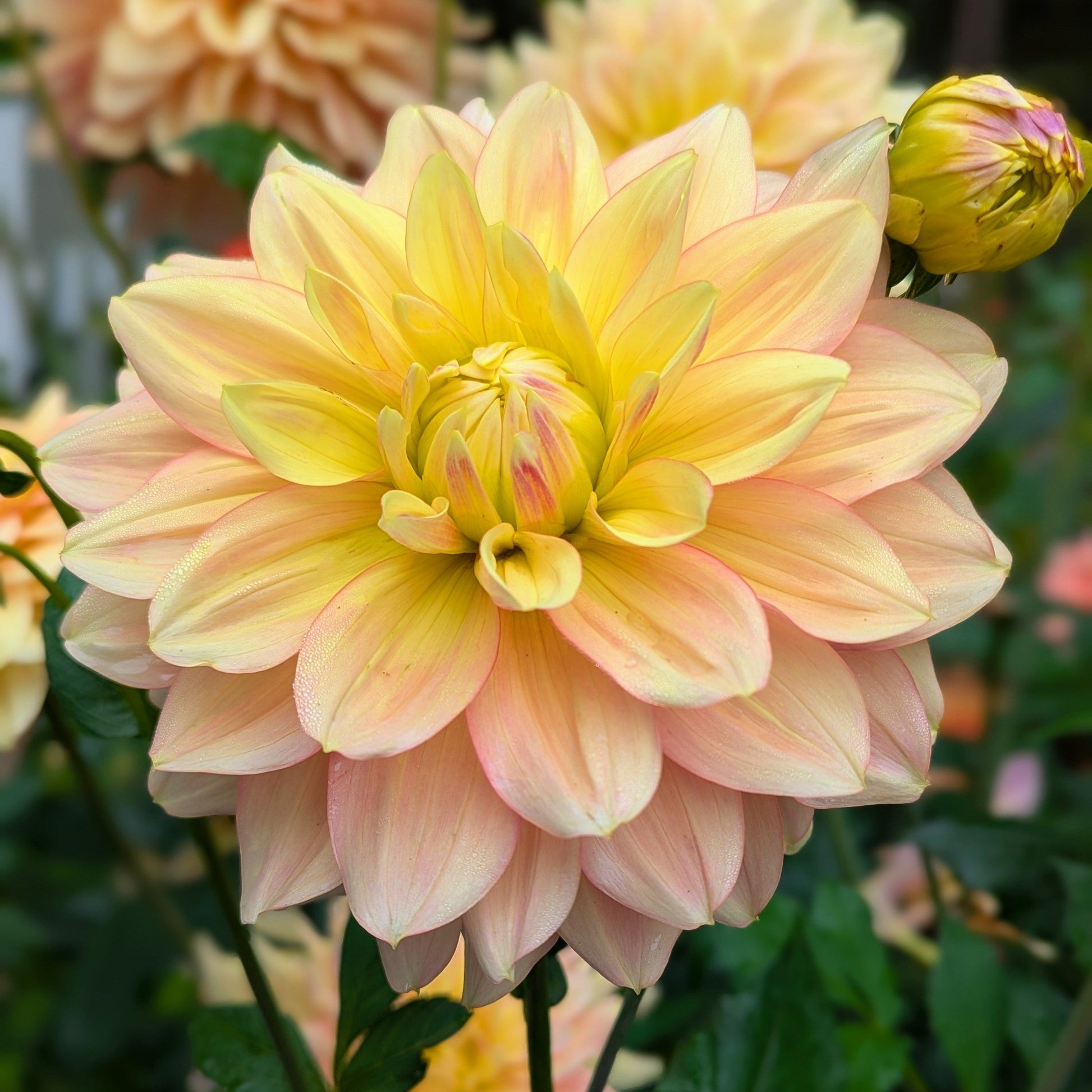 A fantastic light blend dahlia with impressive 7" blooms in dreamy shades of pink and yellow. The slightly darker brush of blush gives great variation to the petals. She's a centerpiece to behold.